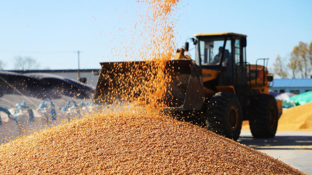 10月19日,在北大荒集团黑龙江红星农场有限公司一家玉米干燥公司的院子里,叉车准备运输干燥选择的玉米。新华社地图