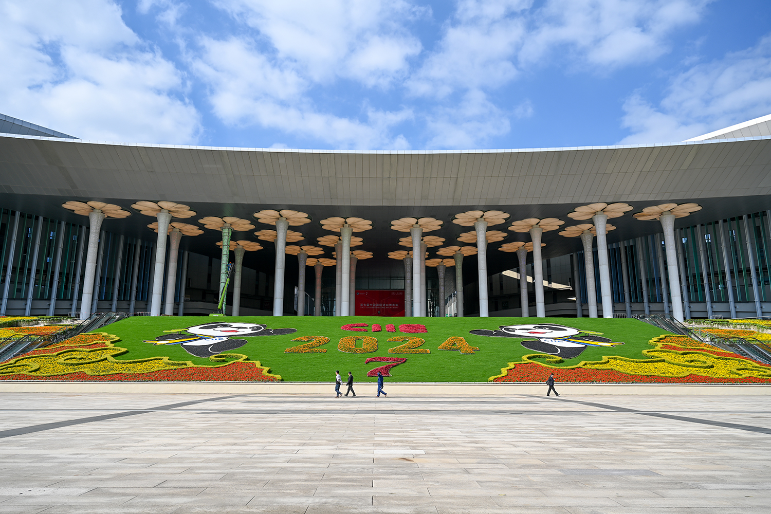 在保证往年表现手法的基础上,本届中国国际进口博览会广场景观通过增加红花的用量来优化梯田花海区域的花卉颜色。基于去年的基础, 蓝、紫、白花比例继续适当降低,面积从11%降至8%。;增加红、黄、橙花的比例,从75%增加到78%。“整个广场空间,”CIIE“2024”字、四层梯田花海、谜宫花园等多个主题花园,选用橙色孔雀草、黄色孔雀草、红色百日草、角堇等多种花卉植物,诠释祥云、渐变云山的图案效果,更好地营造喜气洋洋的广场氛围。新设数字“7”在草坪上。LOGO,它是由彩叶草制成的。