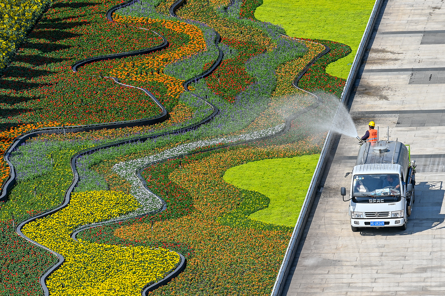 国家会展中心(上海)于2024年10月24日,工人们正在给植物浇水。本报记者 朱伟辉 图