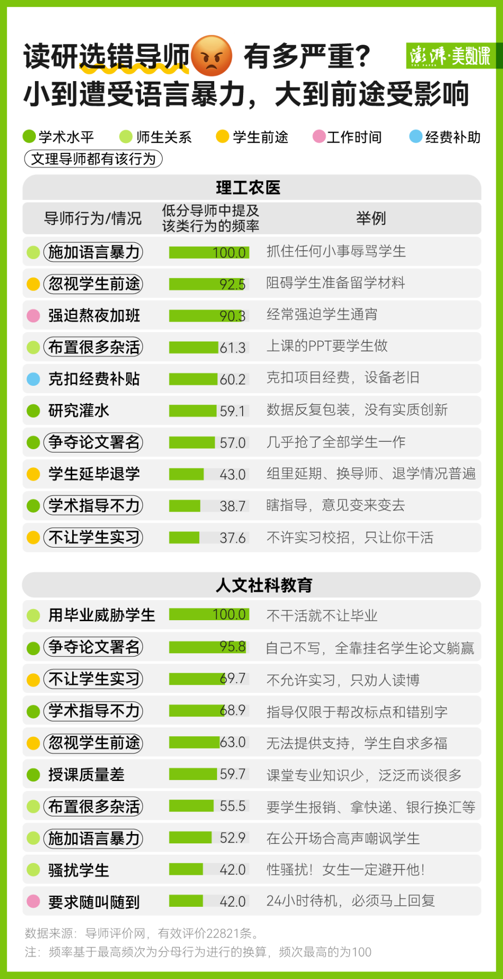 在学术层面,理工科学生对导师在研究中的“注水”不满,而人文社会科学专业的学生对导师普遍谈论的“水课”更加敏感。就工作时间而言,理工科学生由于需要到实验室工作,坚持“996”、强迫导师熬夜加班,避免三舍;人文社会科学研究生更担心被导师随叫随到的压力。就资金补贴而言,与文科专业相比,理工科学生遇到导师扣除资金补贴的可能性更大。