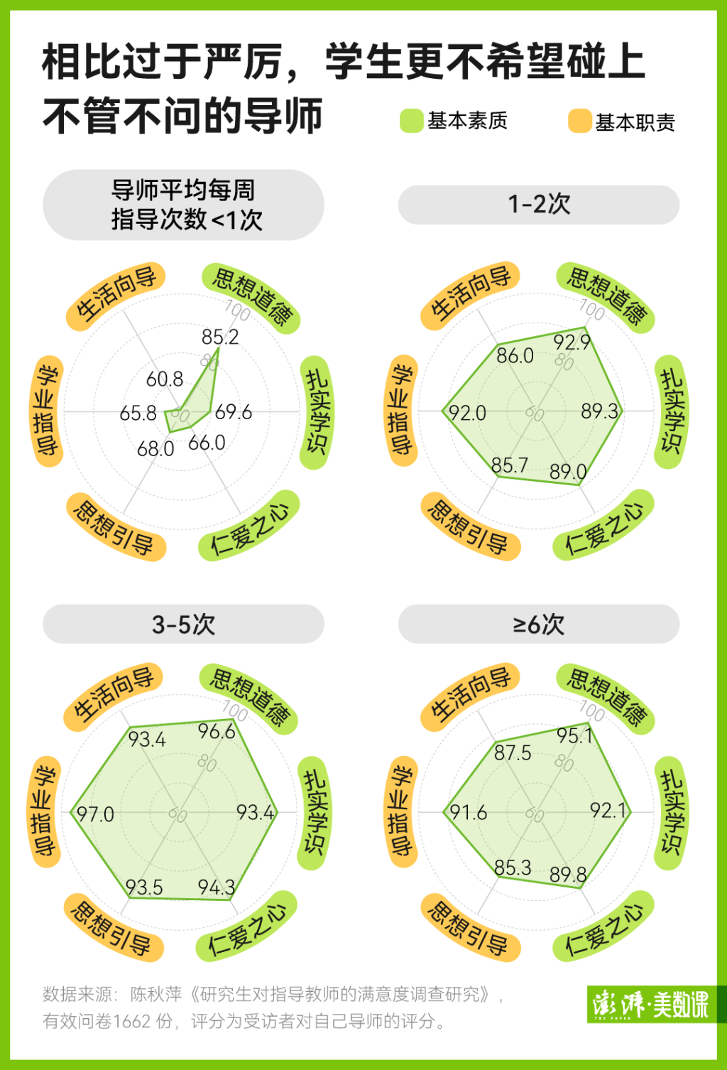 根据陈秋萍的调查发现,导师每周的指导频率是多少? 3-5 第二,学生对导师的满意度最高,最不满意的,不是经常督促学生的导师,而是每周对学生进行指导。 1 导师一次都做不到。