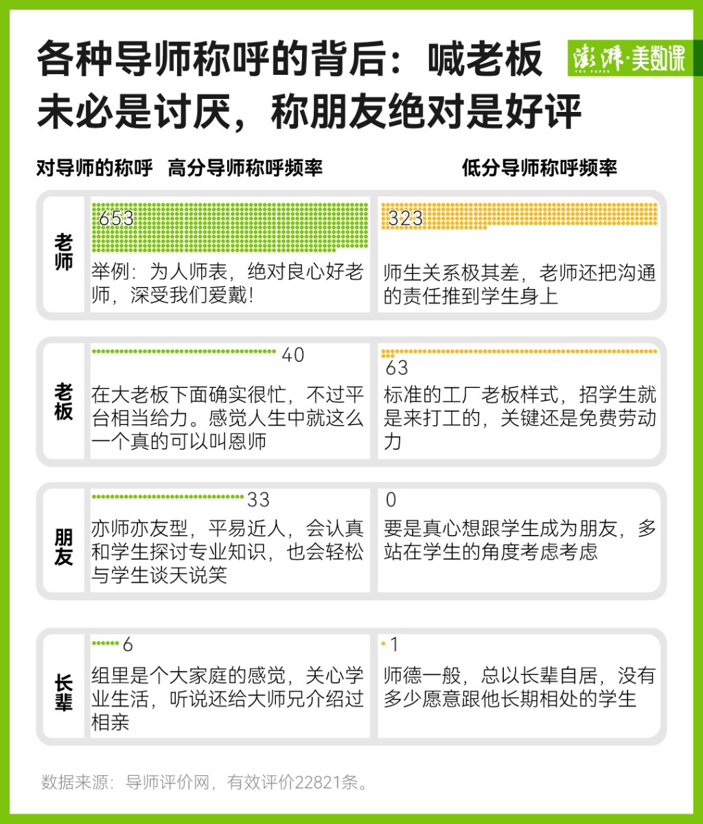 但是,如果师生双方都能实现合作共赢,这个称呼可能并不是一个负面的词。在整理学生对导师的评价时,我们发现“老板”这个词有越来越多的趋势,而且经常被用于学术大牛或者资源丰富的教师,比如有学生安利自己的导师说:“跟着李**大老板,钱根本花不完”。