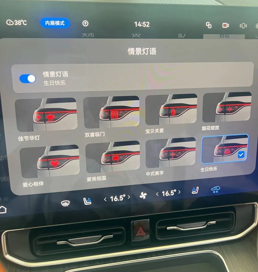 比如问界M9的尾灯图案可以设置为八种类型,如“喜字”、“爱”、“生日快乐”。遇到婚礼、告白等场景,可以适当拉风神车。