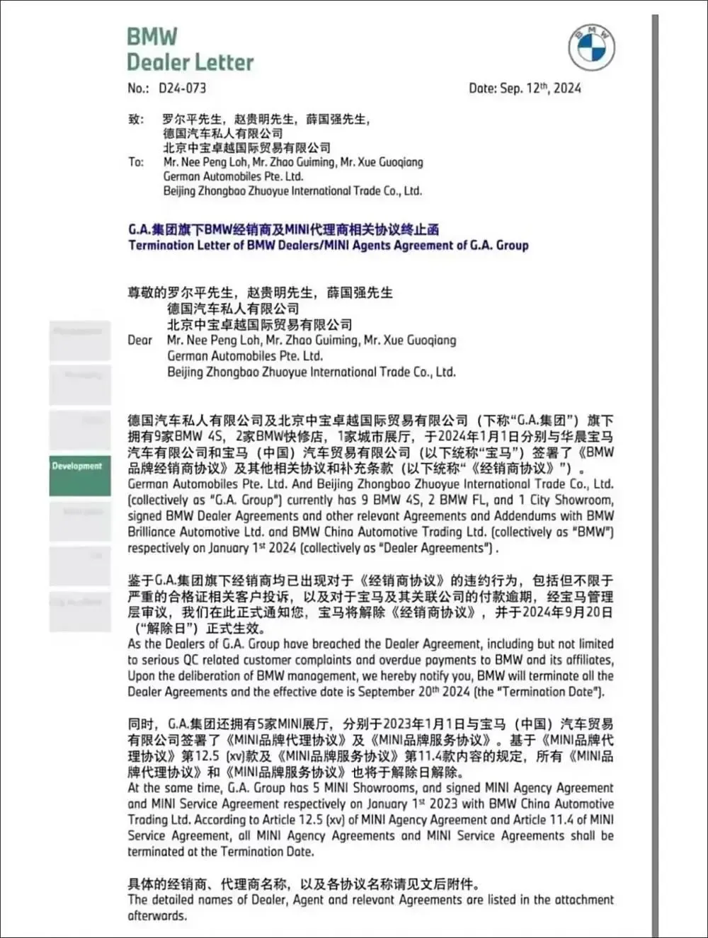 根据网络爆炸协议的终止函,9月12日,宝马总部向罗尔平、赵贵明、薛国强三大自然人主体、德国汽车私人有限公司、北京中宝卓越国际贸易有限公司发出了经销商代理协议的终止函。函中提到,G.A.集团旗下经销商存在包括但不限于严重合格证书相关客户投诉、宝马及相关公司逾期支付等违约行为。