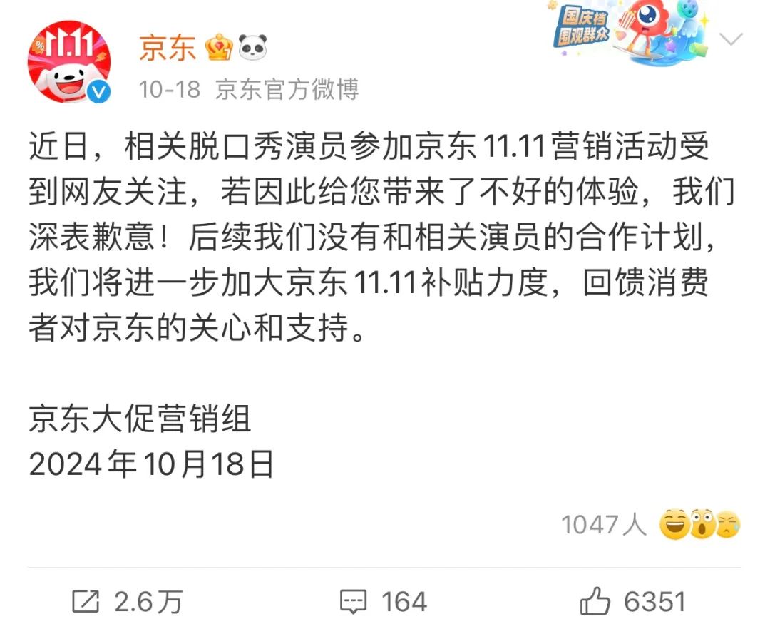 十月十八日,JD.COM在微博上道歉,并表示“后续我们没有与相关演员合作计划”。