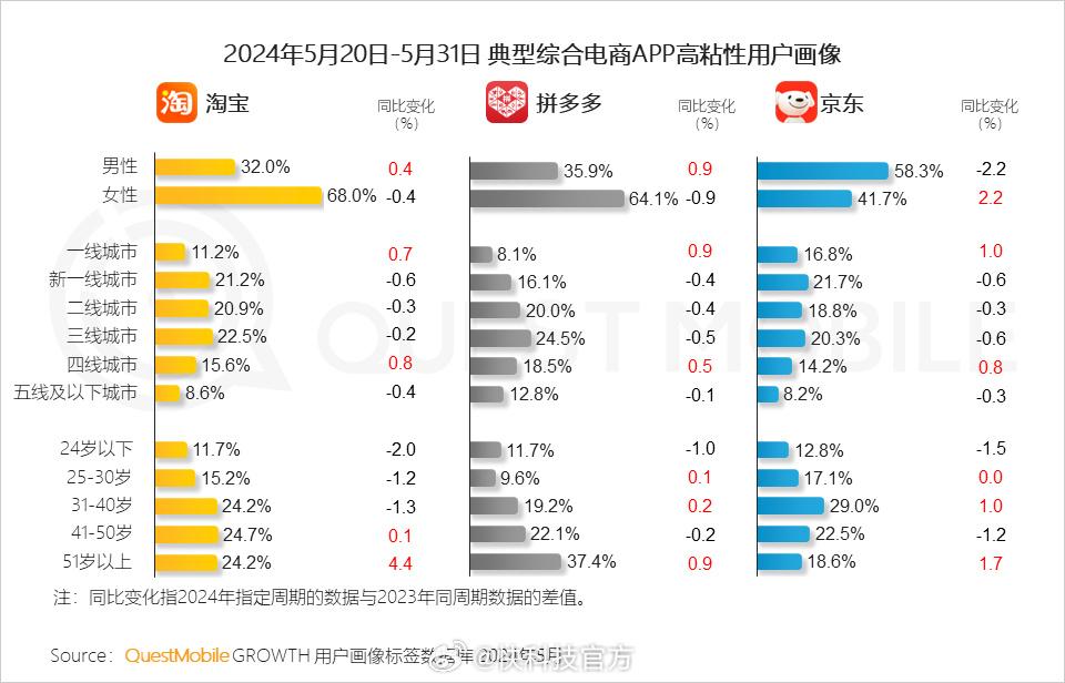 根据QuestMobile的数据,在2024年5月20日至5月31日之间,三线城市以下用户和40岁以上用户在JD.COM高粘性用户画像中的比例明显低于淘宝和拼多多。
