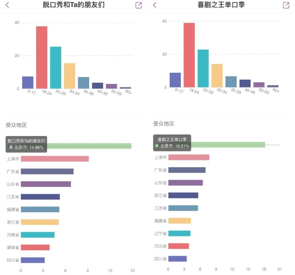 根据艺恩的数据,《喜剧之王单口季》和《脱口秀和TA的朋友》的受众分布最广的地区是北京、上海和广东,这三个地方的比例高达32.96%和31.09%。除了这两个节目,同期热播的其他综艺节目都没有一个在北京、上海、广东排名前三。