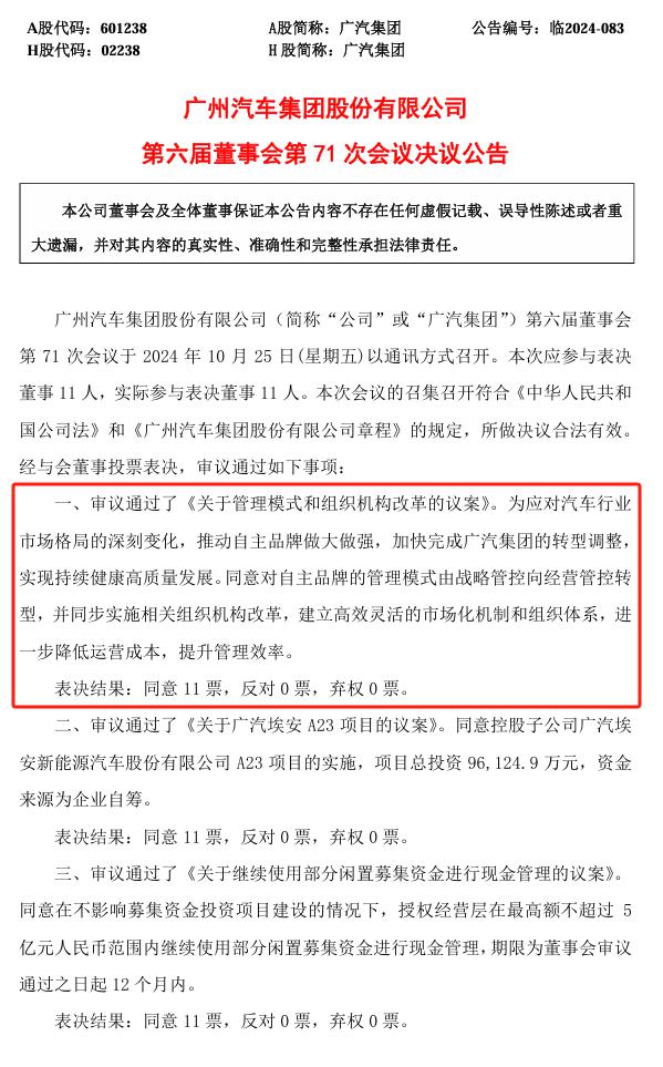 IT 世家 10 月 25 日消息,广汽集团今日发布公告,第六届董事会第一 71 第二次会议审议通过了《关于管理模式和组织机构改革的议案》,同意集团对自主品牌的管理机制由战略控制向管理控制转变,同步实施相关组织体系改革,建立高效灵活的市场化机制和组织体系,进一步降低企业成本,提高管理效率和管理水平。