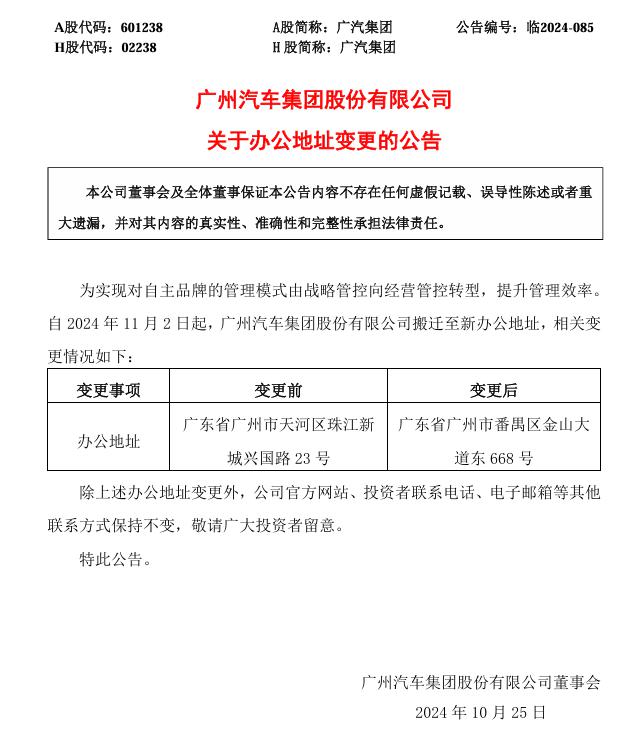 为了实现自主品牌的管理机制从战略控制向管理控制的转变,提高管理效率。自我管理 2024 年 11 月 2 日起,广州汽车集团有限公司搬迁到新办公地址。位于广东省广州市天河区珠江新城兴国路 23 号码,调整为广东省广州市番禺区金山大道东 668 号。