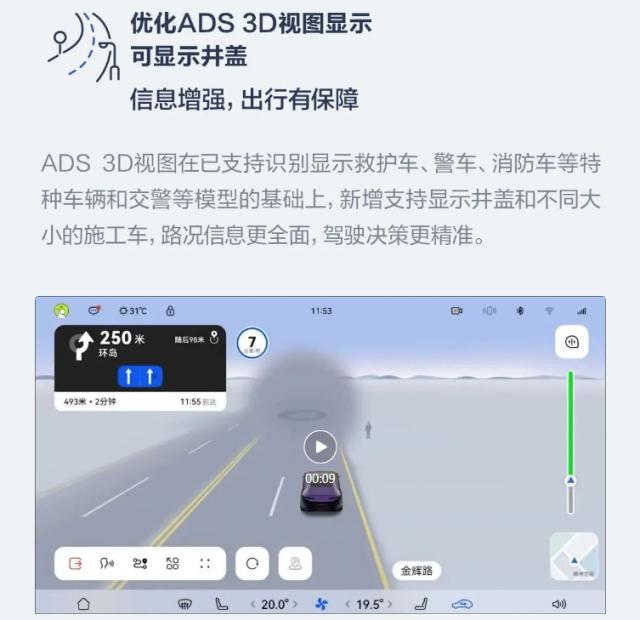 中控屏的 ADS 3D 支持视图和导航分屏显示,可边看导航边查看 ADS 智驾意图