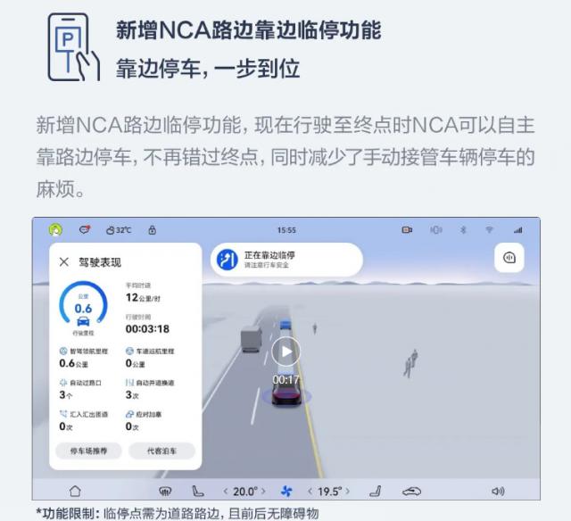新增 NCA 路边临停功能,现在开车到达终点 NCA 可靠路边自行停车,在减少手动接管车辆停车麻烦的同时,不再错过终点。