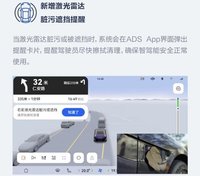 如果激光雷达脏了或者被遮挡了,系统就会 ADS App 界面弹出提示卡片,提醒驾驶员尽早清洗,确保智能驾驶能够安全正常使用。