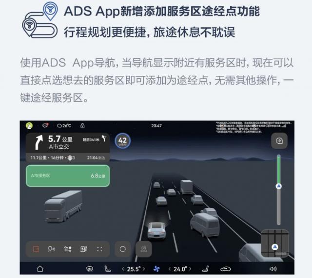 使用 ADS App 导航,当导航显示周围有服务区时,可以直接选择自己想去的服务区作为添加方式点,无需其他操作,服务区一键式。