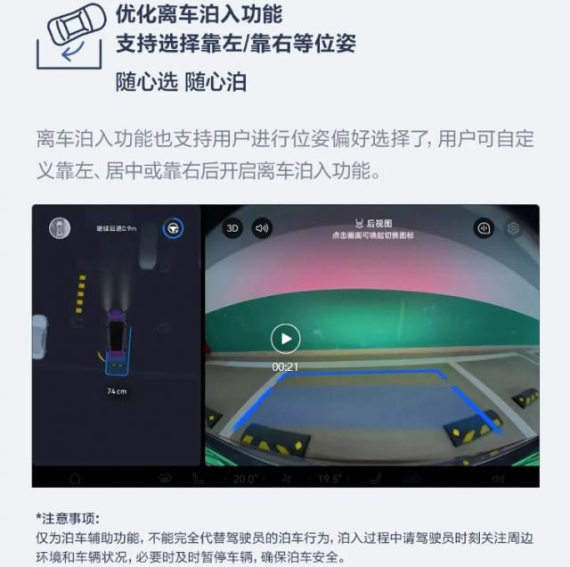 支持选择靠左 / 随意选择靠右等位位置的离车泊入功能也支持用户选择位置偏好,客户可自定义向左、居中或向右打开离车泊入功能