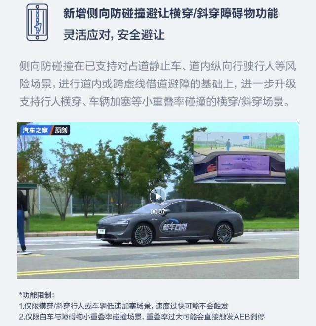 侧面防碰撞已经得到支持。占路静止车、道路上垂直行驶的人等待风险情况,在道内或跨斜线借道避障的基础上,增加新的针对横穿。 / 主动避让功能,如斜穿梭人、车辆堵塞等低速行驶路况下小重叠率撞击场景。