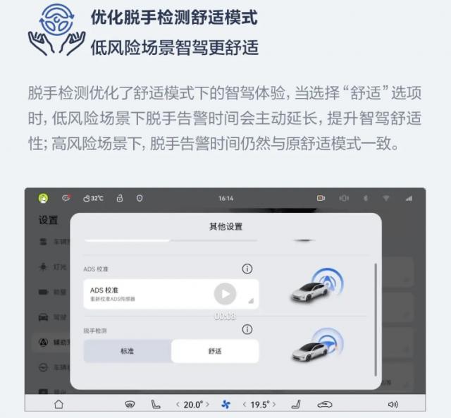 脱手检查改善了舒适模式下的驾驶体验,在选择“舒适”选项时,可以在低风险场景中脱手报警。主动增加,提高智能驾驶舒适度;在高风险场景中,出售报警时间仍与原舒适模式一致