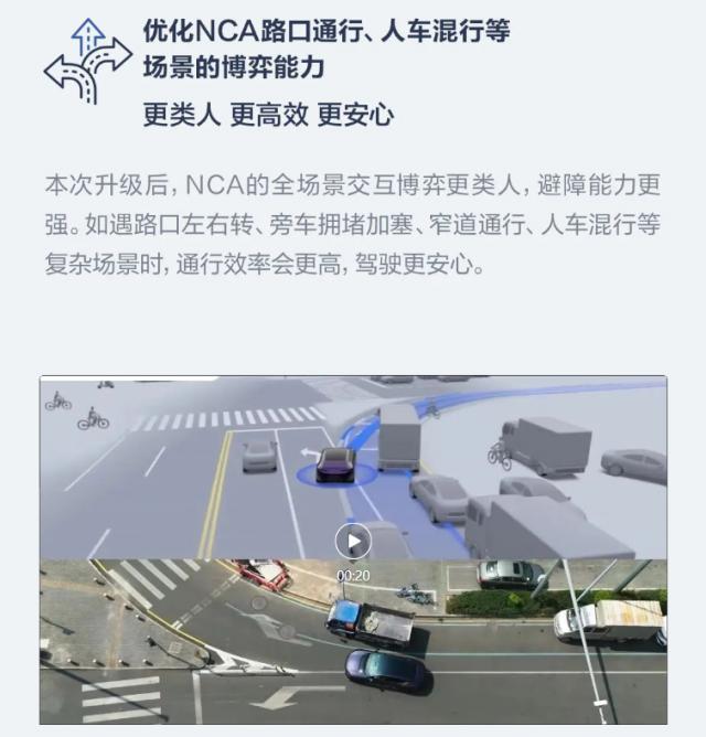 这次升级之后,NCA 整个场景交互游戏更类人,避障能力强。如遇路口左右转、旁车拥堵、窄道通行、人车混合等复杂场景,通行效率会更高,驾驶更放心。