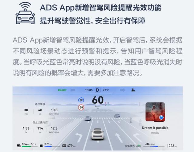 开启智能驾驶后,系统会根据不同的风险情况动态进行。预警和提醒,告诉用户智能驾驶的风险程度。当呼吸光常亮时,说明没有风险。当蓝色呼吸光消失时,说明有风险的概率会增加,所以要多注意路况。