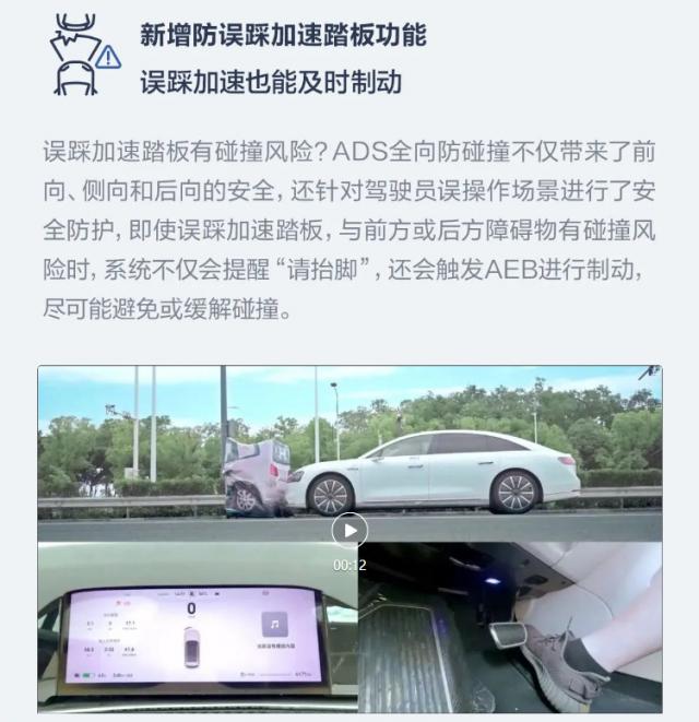ADS 全向防撞不仅带来了前、侧、后的安全性,还对驾驶员误操作场景进行了安全防范,即使开始误挂, R 档位或者想倒车却误挂 D 当与前面或后面的障碍物发生碰撞风险时,系统不仅会提醒“请确认挡位”,还会触发碰撞。 AEB 进行制动,尽可能避免或缓解冲击