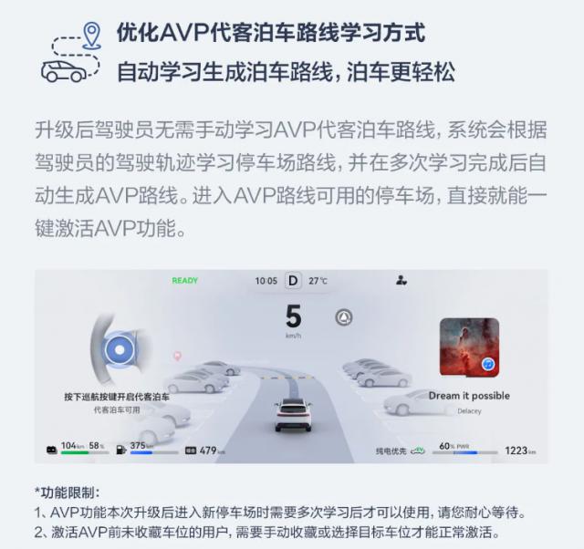 司机升级后不需要手动学习。 AVP 代客停车路线,系统会根据驾驶员的驾驶轨迹学习停车路线,经过几次学习,一键生成 AVP 路线。进入 AVP 线路可用的停车场,可直接一键激活 AVP 功能