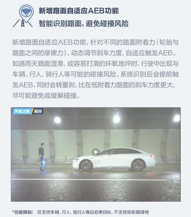 增加路面自适应性 AEB 对不同路面附着力(轮胎与路面之间的摩擦),功能,动态调节制动力,自适应触发 AEB。如果下雨天路面湿滑或容易偏离环氧地板,驾驶过程中可能会与车辆、行人和骑行者发生碰撞,系统识别后会提前触发。 AEB,与此同时,转重制动比低附着力路面的制动强度更大,尽可能避免或缓解冲击。