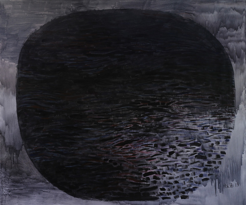 《天空》一章中,展厅是黑色的,策展人试图创造一种混乱的状态,并展示了艺术家从宇宙天空中截取的创作灵感。其中,艺术家余友涵的作品《抽象2019》 十-1是他晚年的绘画,他在画布上展现了画笔的痕迹,展现了人与宇宙之间的节奏。梁绍基的作品是用蚕:蚕在可滑动的范围内吐出丝线,讲述身体与原世界的关系,最终形成艺术作品。