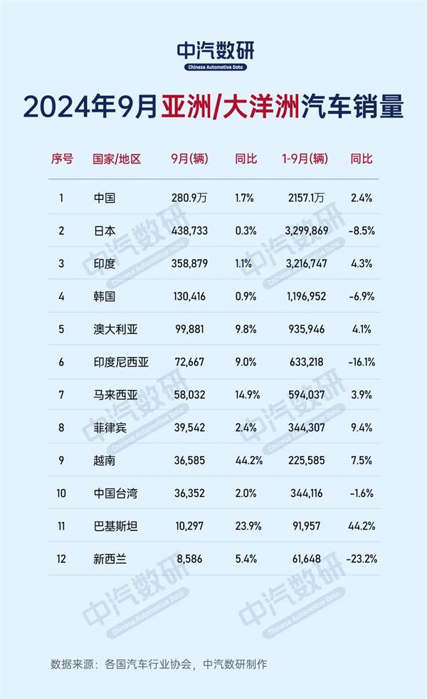 2024年9月全球各国汽车销售出路:中国280万台一枝独秀。