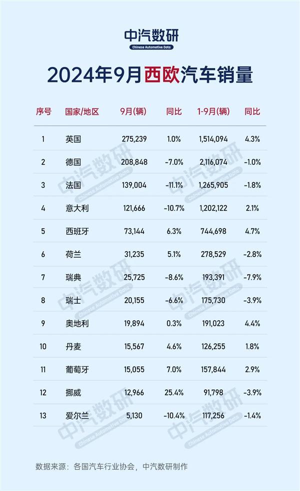 德国排名第二,本月销售。 20.88 万台,今年 1-9 每月累计销售额为 211.60 万台。