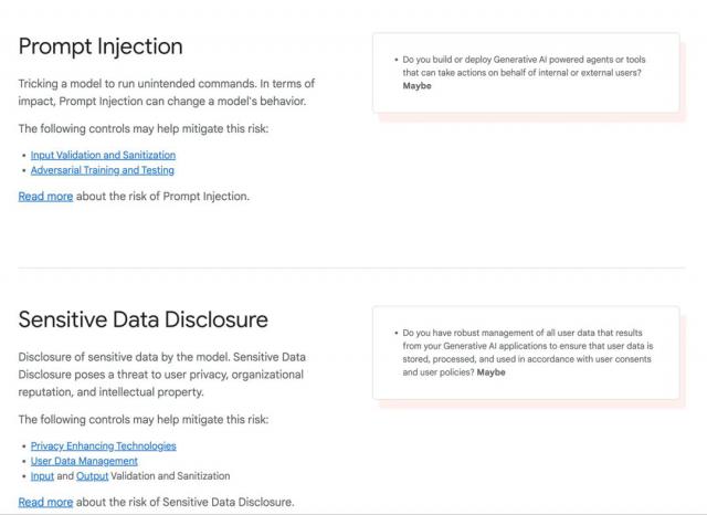 目前谷歌已在新网站上 SAIF.Google 上提供 SAIF 风险评估工具,通过问卷运行,客户回答后会生成定制的检查清单,指导他们保证。 AI 系统安全。