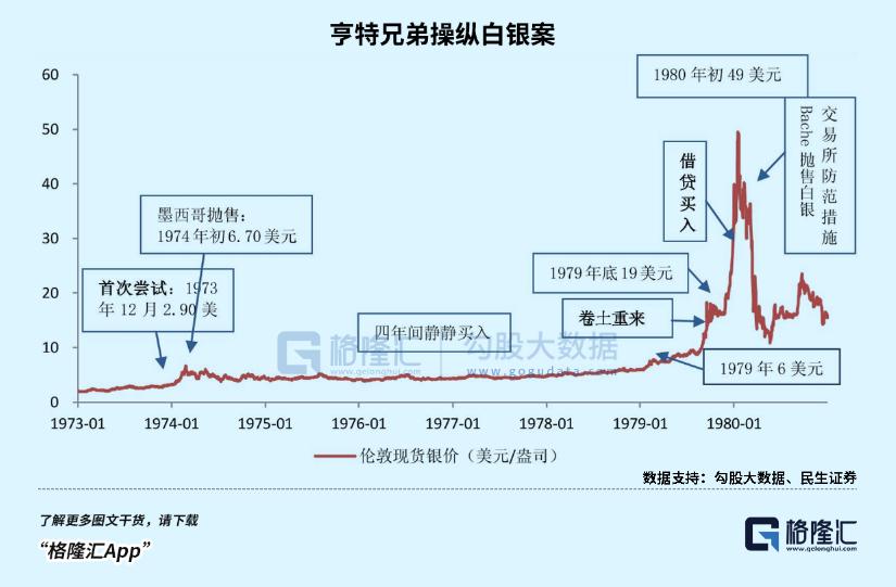 一九七三-一九七九年,美国亨特兄弟疯狂借钱抄底,共吃下2亿盎司白银,几乎掌握了整个市场的话语权。