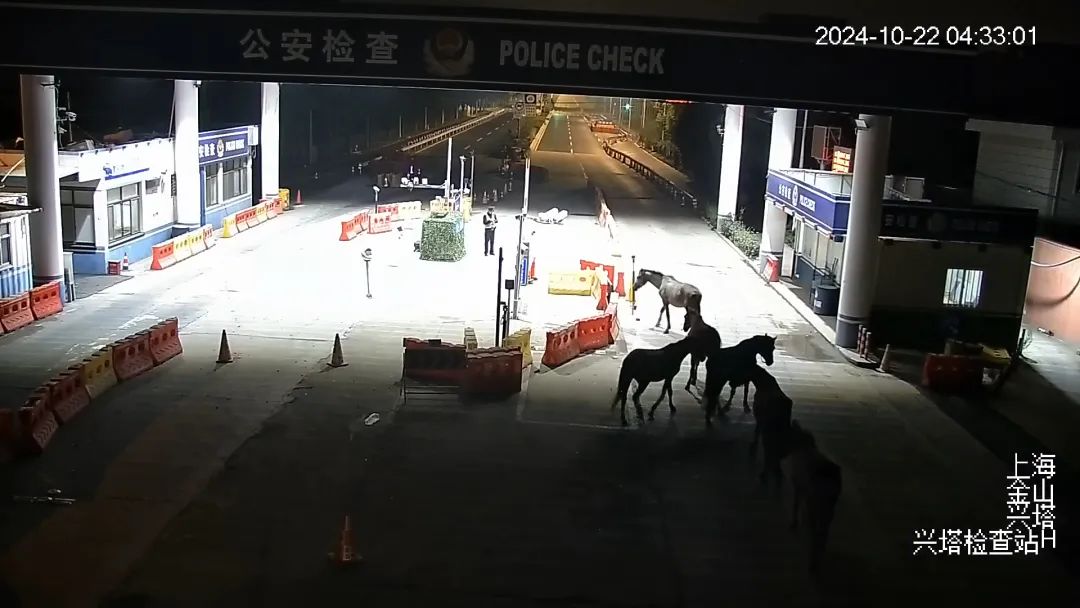 10月22日凌晨5点,金山市公安局兴塔检查站值班民警发现,7匹马从浙江进入兴塔检查站,然后在兴塔社区行走,没有马的主人陪伴。