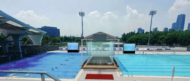 值得注意的是,在PSA(国际职业壁球协会)旗下的比赛中,这是第一次出现以游泳池为背景的壁球场。