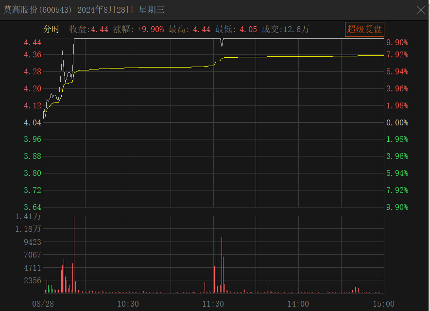 此外,莫高股份宣布,在筹备重大资产重组前夕,股价大幅上涨。8月28日上午开盘后不久,莫高股份的股价涨停,一直持续到当天收盘。