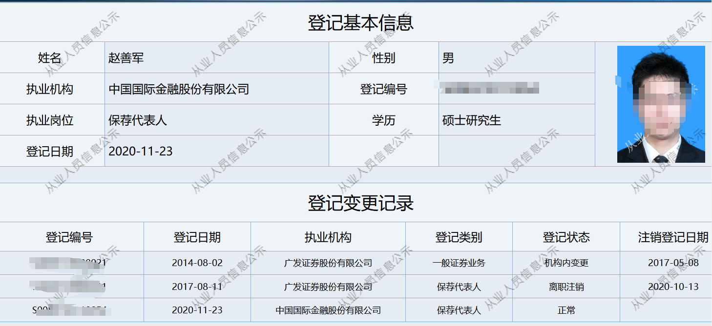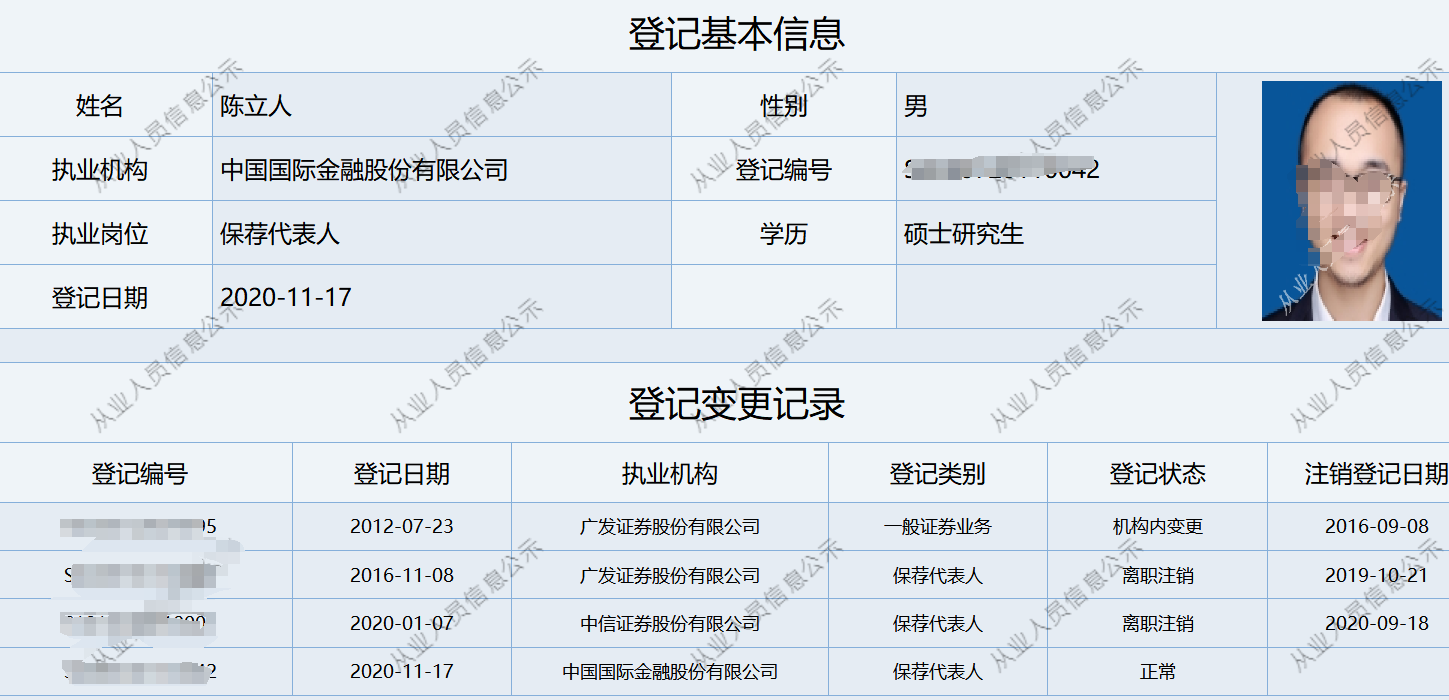 此次受罚的另一位保荐代表人陈立人曾在广发证券担任保荐代表人一段时间。2020年初,他在中信证券担任保荐代表人一段时间。同年11月17日,他开始担任CICC的保荐代表人。