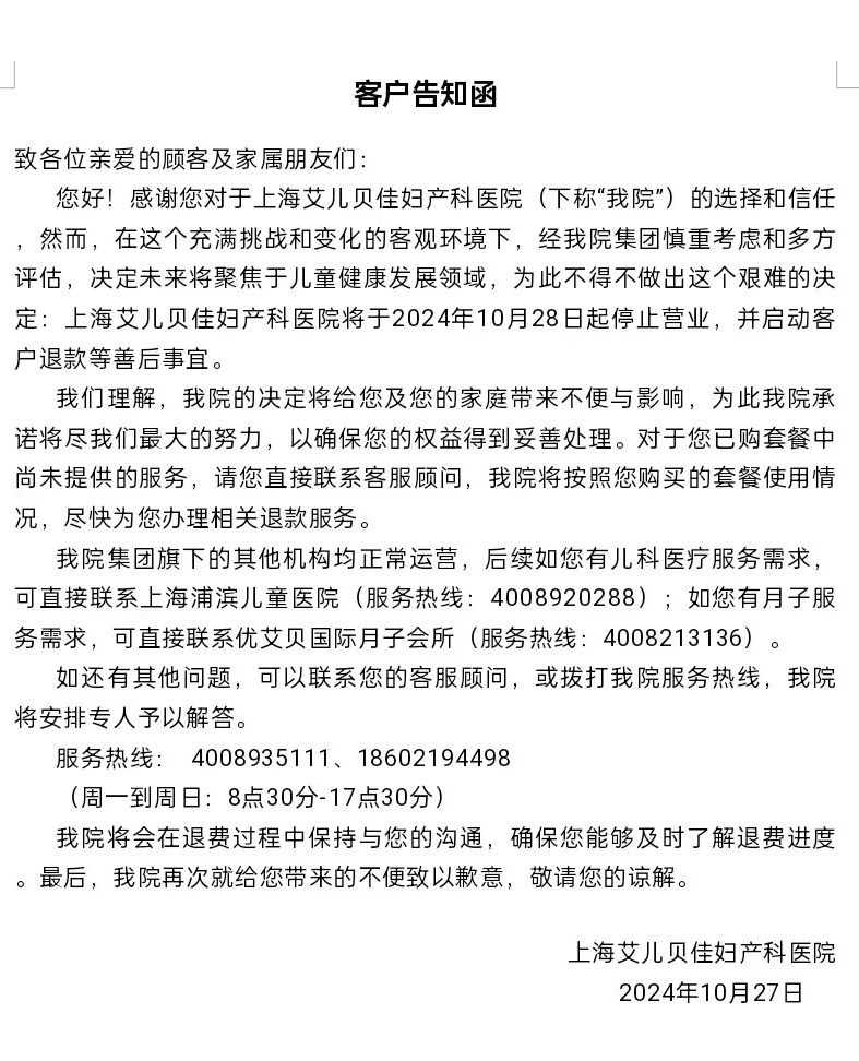 根据网上发布的《客户通知书》,上海艾儿贝佳妇产科医院将于2024年10月28日停业,启动客户退款等善后事宜。10月25日,该报记者致电该医院,工作人员验证了关闭是真的。至于退款,医院工作人员表示需要消费者与客服顾问进行具体沟通。
