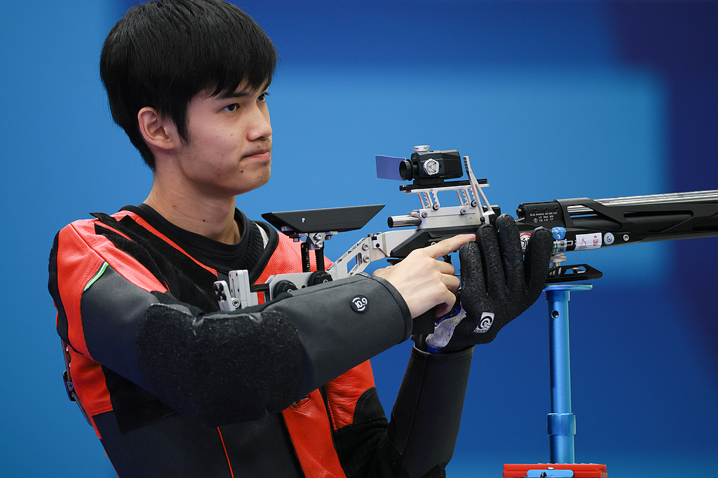 2024年7月29日,法国、巴黎奥运会射击男子10米气步枪决赛,盛李豪夺冠。视觉中国 资料图