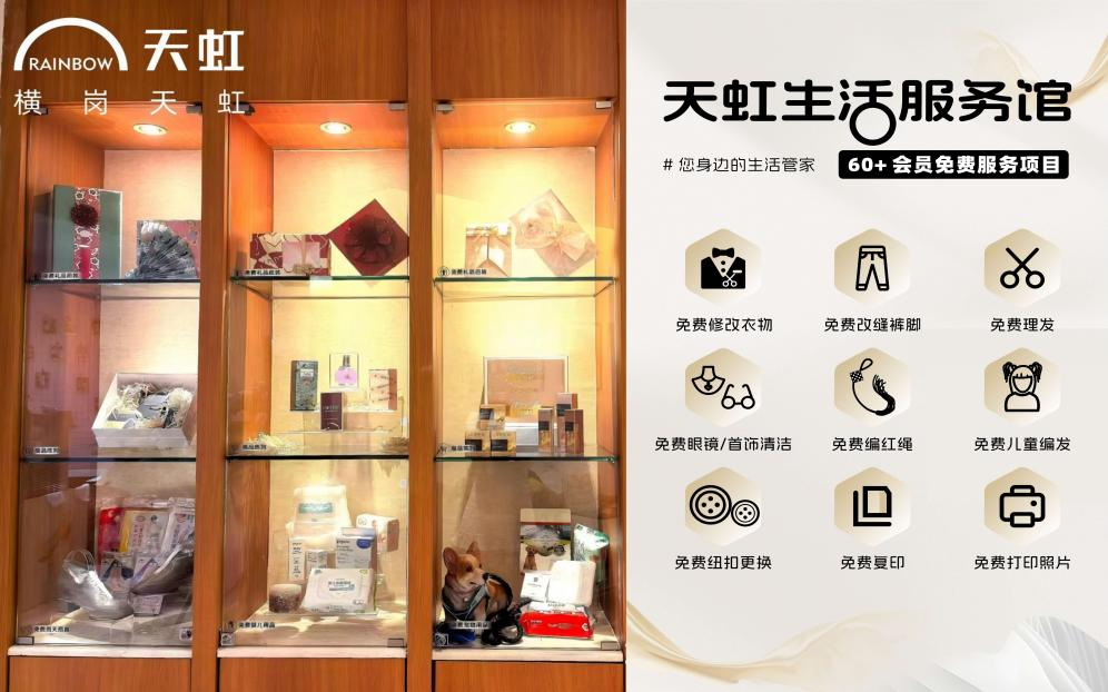 十月一日,天虹在深圳横岗店成立了“天虹生活服务馆”,为所有天虹成员提供60% 免费会员服务,如免费修改衣服和裤子、免费理发、免费编织绳索、免费珠宝眼镜清洁、免费更换扣子、免费打印等。注意,都是“免费”的!