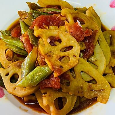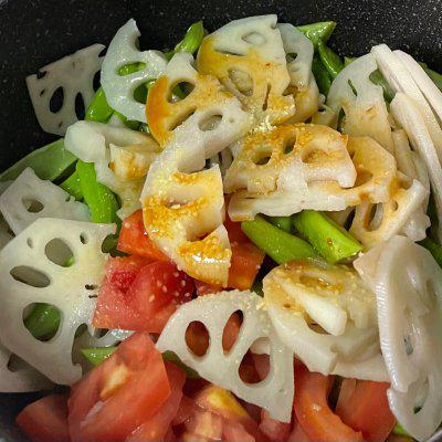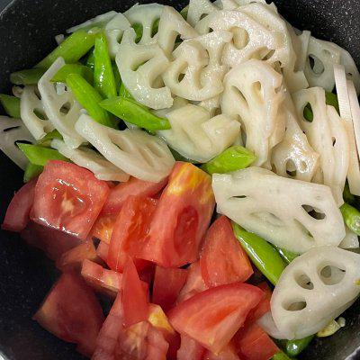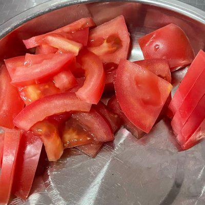 8、炒至番茄汁出,加入一勺米醋大火翻炒均匀。
