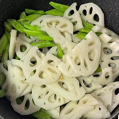 4、四季豆先用热水焯一下 5 每分钟沥干水分,将辣椒油放入热锅中炸葱蒜,放入煮好的四季豆爆锅。
