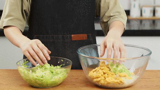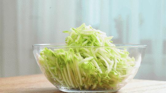 将西葫芦擦成细丝,倒入盐中,搅拌均匀。