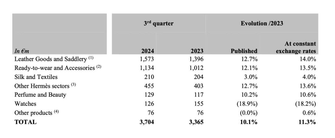 在固定汇率下,根据业务线,据记者整理,第三季度,除手表业务外,其他业务部门均实现增长,其中皮具、鞍具业务增幅最大,为14%。手表的销售收入减少了18.2%,是预期的两倍。