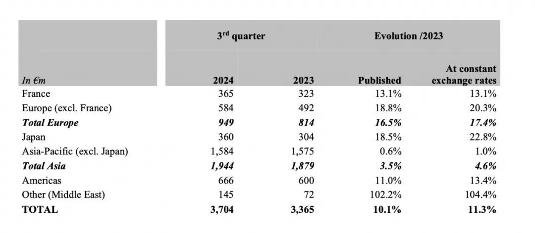 根据固定汇率计算,记者发现,今年前三季度,日本和欧洲地区(法国除外)的增长率领先,分别为22.8%和20.3%。与法国相比,美洲地区的增长率接近13.4%和13.1%。亚太地区(日本除外)同比增长率仅为1%。