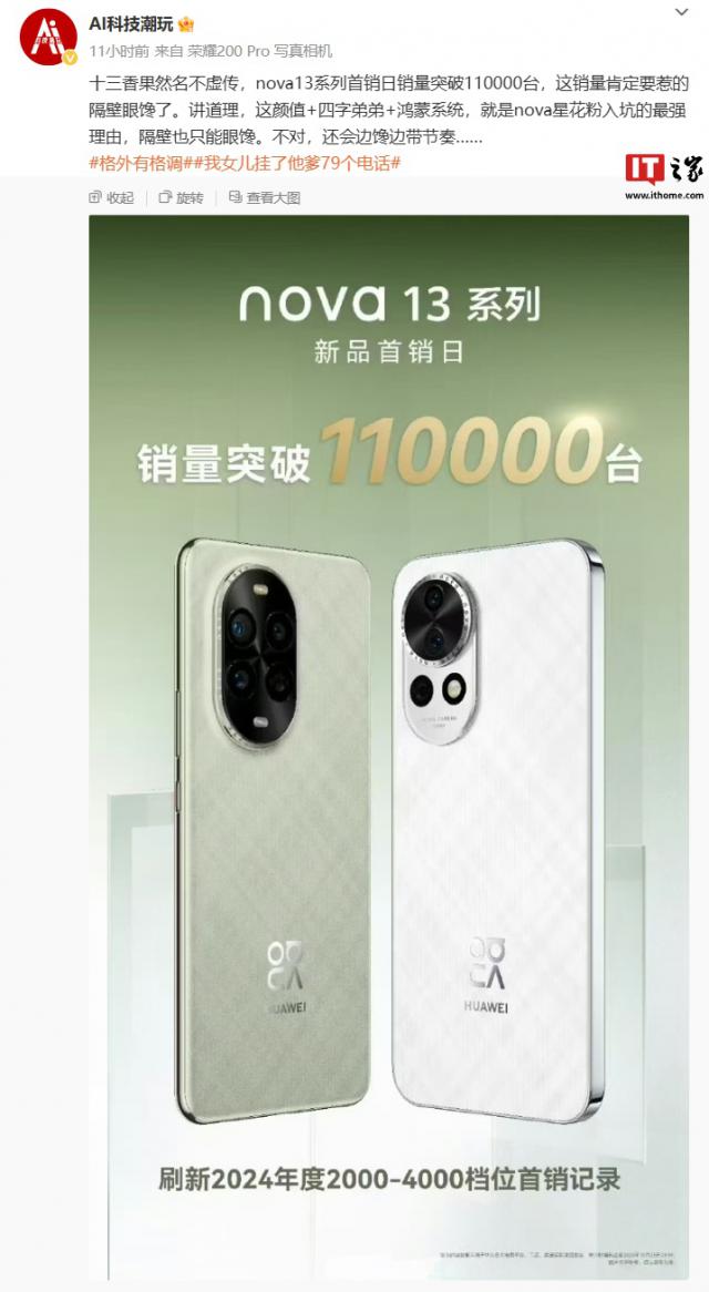根据昨天多位博主的分享,华为 nova 13 移动电话首销日销售突破 11 万台,刷新 2024 年度 2000-4000 元挡位首销记录。