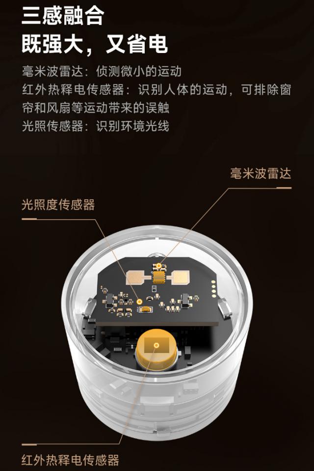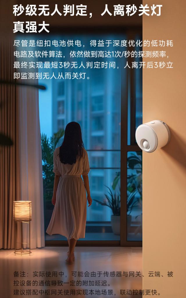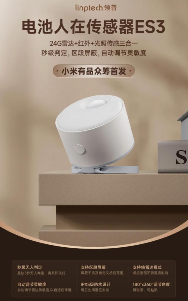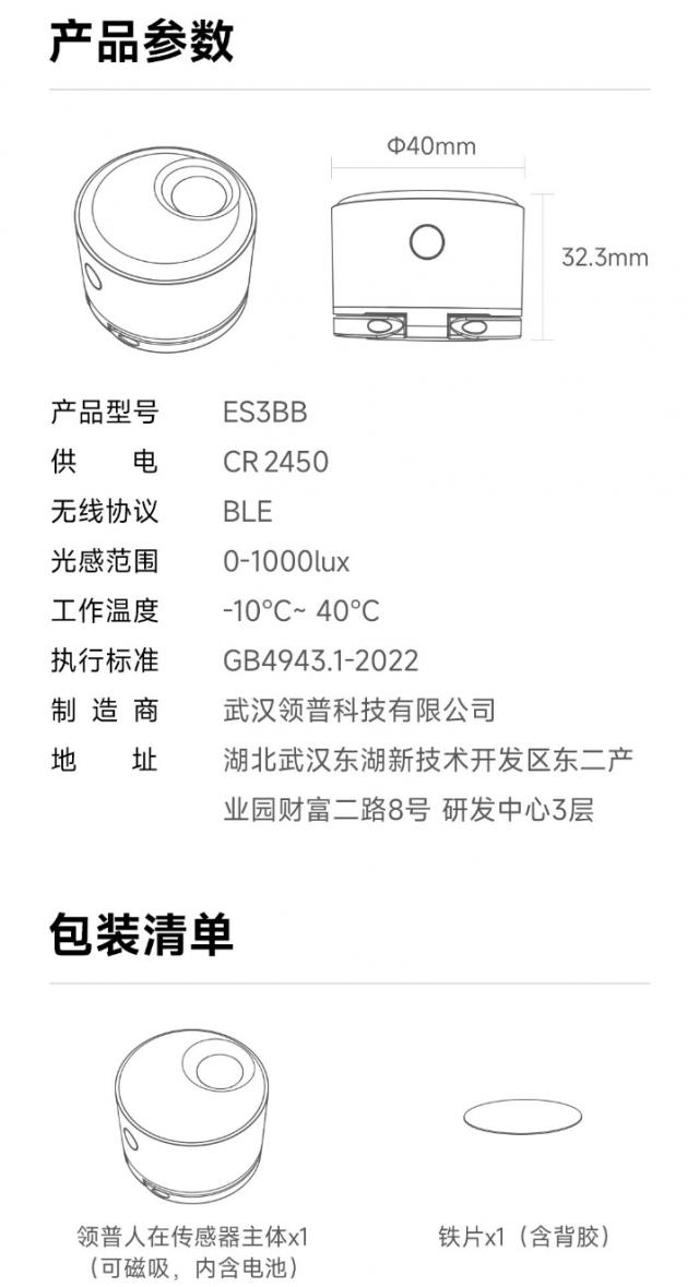 据报道,领普电池存在传感器。 ES3 选用 24G 雷达 红外热释电 光泽使用机制感应 CR2450 电池电力供应,官方声称“无人判断时间” 3 秒,仍然可以实现续航, 2.5 年"。