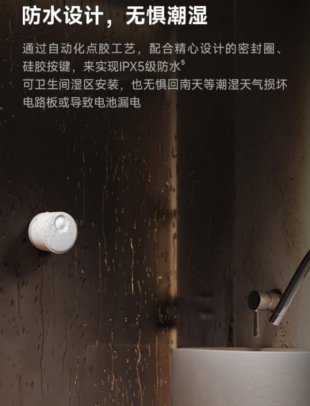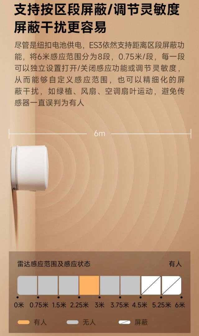这个人选择了传感器 IPX5 级别防水设计,支持根据距离区段进行屏蔽、调节灵敏度等待功能,区段分辨率 0.75 大米,最大的支持 6 米运动识别、4 米存在识别、180 度检测视角。