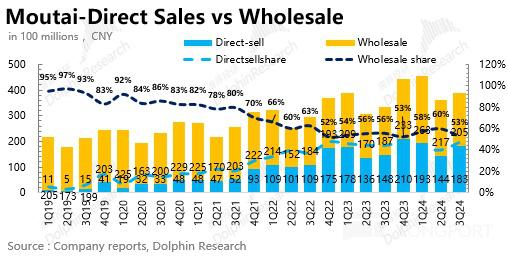 前几年茅台业绩逆势高增的背后,实际上是通过大幅提升直销比例、非标酒(属相、优秀产品等)的成交量来实现的。).但海豚君认为,一方面,直销比例接近一半,提升空间有限;另一方面,非标酒库存在过去几年大幅累积,难以继续增加成交量。因此,业绩增长放缓完全在预期范围内。对于投资者来说,茅台的业绩 "稳定 "度过行业转型期,实现消费群体,消费场景的转型也许是最好的解决方案。