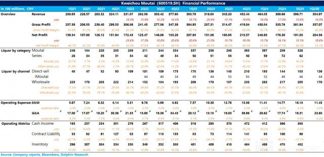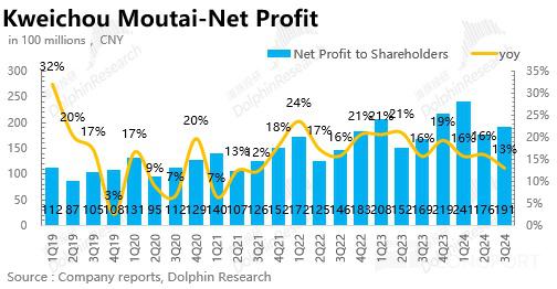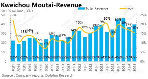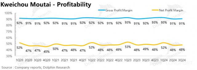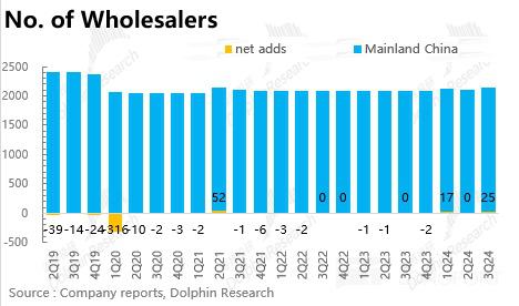 另外,从经销商数量来看,截至第三季度,2024 年度茅台共增强 42 家庭经销商,而且都是系列酒类经销商,其中第三季度增加了 25 家。不难发现,茅台还是很重视系列酒的。虽然第三季度系列酒的增速有所放缓,但海豚君认为,经过阶段性控制,系列酒在消化库存后,仍然是茅台未来业绩增长的关键环节。