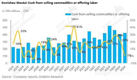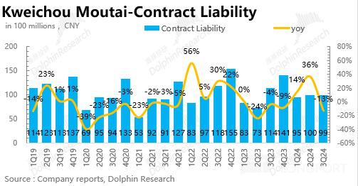 第四,从现金流的角度来看,茅台第三季度实现了回款 426 同比只增加了亿元 1%,与前两个季度相比明显减速,海豚君认为主要是企业主动控货挺价。 "贮水池" 根据合同负债,茅台合同负债在第三季度为 99 一亿元,与第二季度末基本一致,说明渠道信心相对稳定。