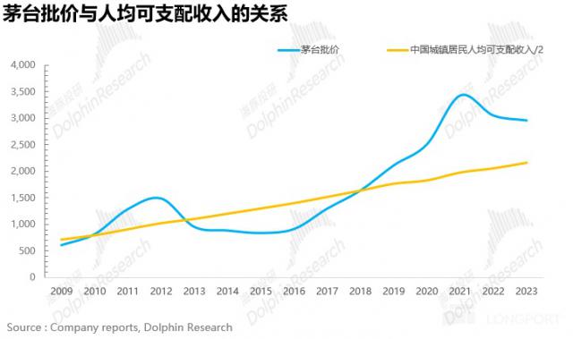 正如张德芹董事长在股东大会上所说,茅台的品牌价格必须与目标消费群体相匹配,价格会随着经济和社会形势的变化而调整。因此,进一步分析可以发现,当茅台的批价大大偏移了人均可支配收入的一半时,茅台通常会干涉,促使批价回归理性,而目前人均可支配收入的一半在 2200 元附近,所以海豚君感觉到了 2200 元是茅台批价的合理水平。