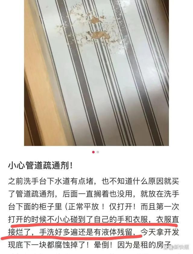 几乎每个家庭都需要管道疏通剂,其化学成分大多含有强碱性成分,可以与水、油、头发等各种污垢反应分解,从而缓解堵塞。此前,由于管道疏通剂储存或使用不当,发生了几起“伤人”事故。